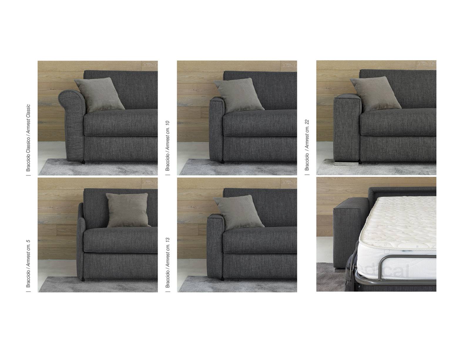 Divano letto con infinite configurazioni, braccioli di varie forme e dimensioni per ottenere quasi un su misura. Il letto matrimoniale da cm 160 x 200 può essere inserito in un divano che va da cm 190 a cm 224 a seconda del bracciolo scelto. Il materasso è alto come quello di un vero letto. Produciamo tutte le misure fino alla poltrona con letto cm 75 x 200. E’ completamente sfoderabile e realizzabile con vari tipi di tessuti e colori.