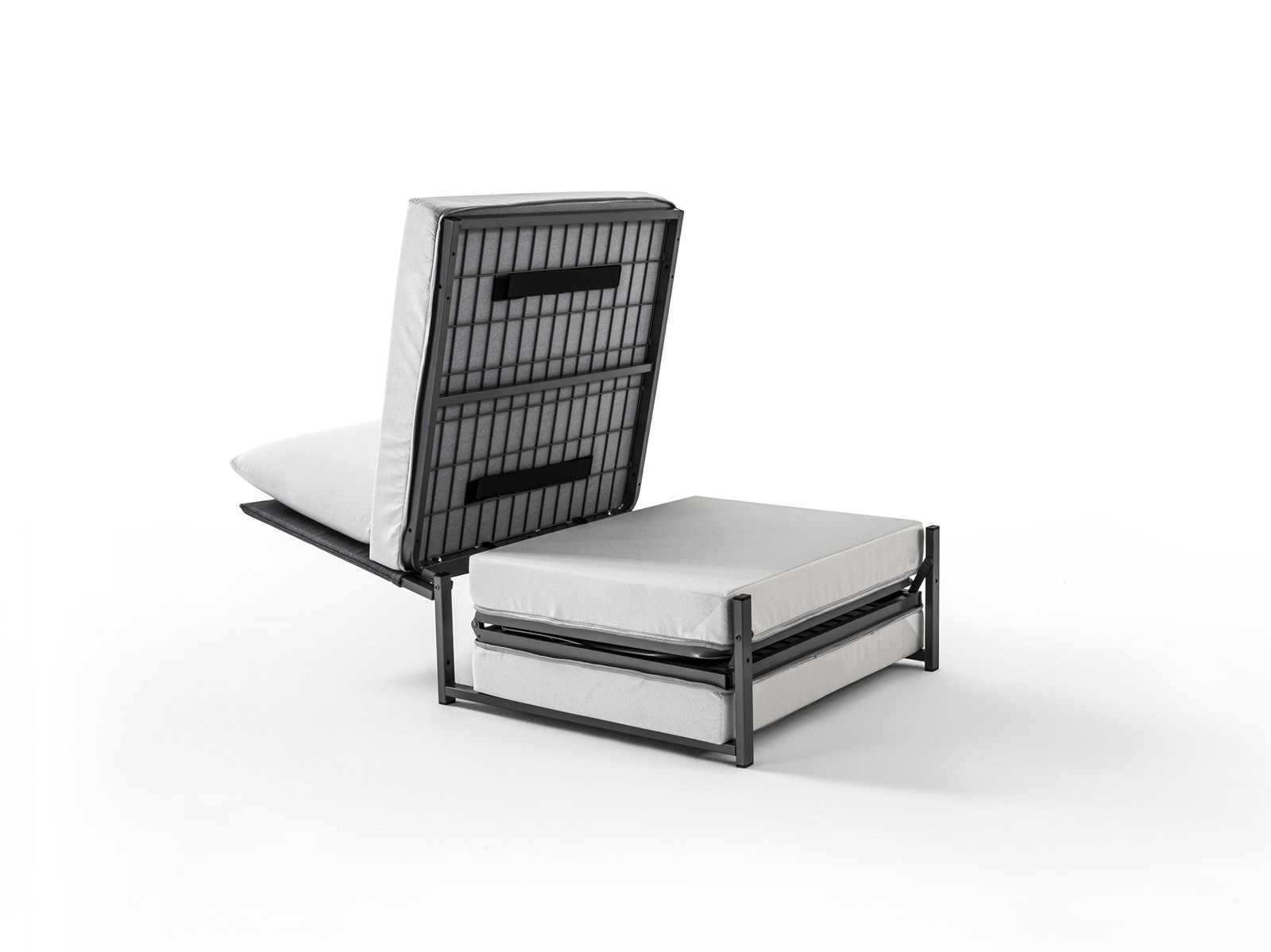 Completa di guanciale che funge da schienale quando la poltrona è chiusa. Rivestimento completamente removibile.